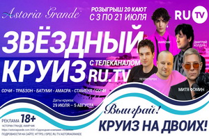 29 июля из Сочи в Турцию отправляется комфортабельный круизный лайнер Astoria Grande. На борту – самые яркие звезды и ведущие телеканала RU.TV. Хотите присоединиться к ним? Главный русский музыкальный телеканал дарит такую возможность!